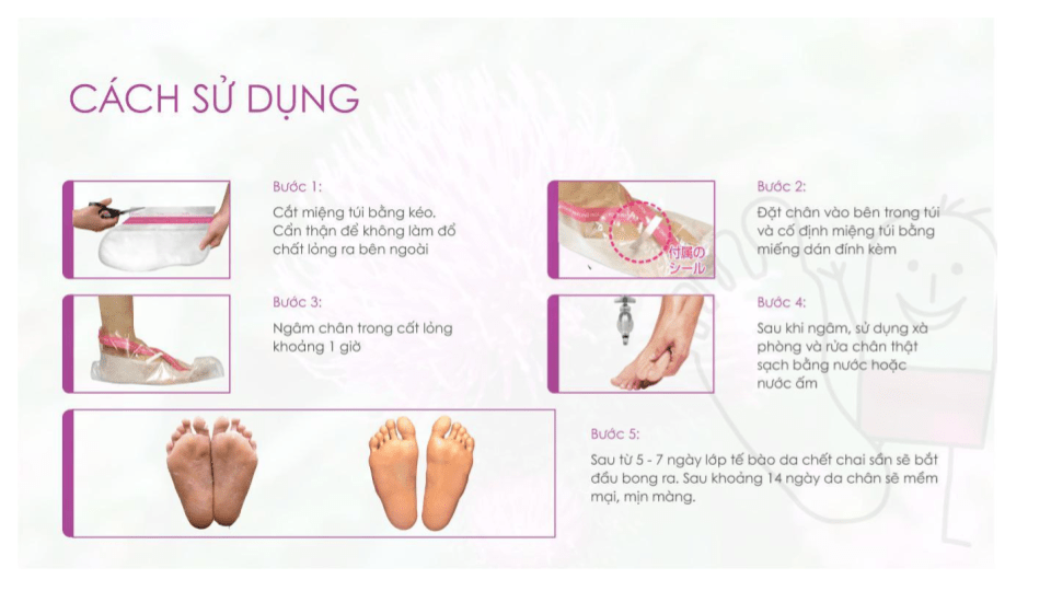 - Túi ủ bao bọc toàn bộ bàn chân giúp chất lỏng trong túi ủ từ từ thẩm thấu đồng đều vào cả những vùng kẽ chân nhỏ nhất, làm mềm da, hoà tan các liên kết giữa các tế bào da chết, loại bỏ da chết khô sần một cách hiệu quả